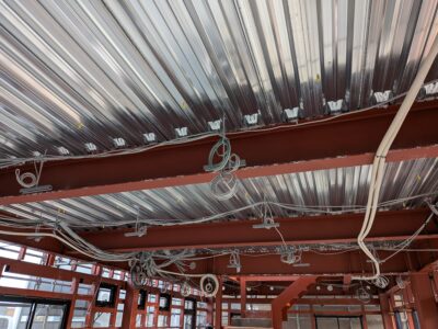 配線ルートを着手前に検討し支持材を取付けて関連業者さん達の邪魔にならないように気配りが大切です。